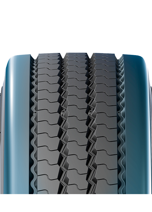 • Desenho da banda de rodagem específico para semirreboques (principalmente Vanderléia e Bi-trem 9 eixos) com 4 sulcos longitudinais e ombros arredondados, melhor distribuição das pressões no contato com o solo, desgaste mais regular e maior resistência ao arraste.