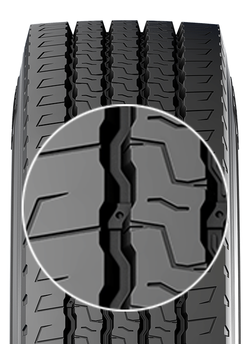 • Desenho robusto da banda de rodagem, apresentando uma escultura lamelizada (com ranhuras) um composto de borracha de alta tecnologia e largura otimizada (+10mm*), oferecendo um desgaste mais regular da banda de rodagem e um excelente rendimento quilométrico na 1ª vida (até +10%*).